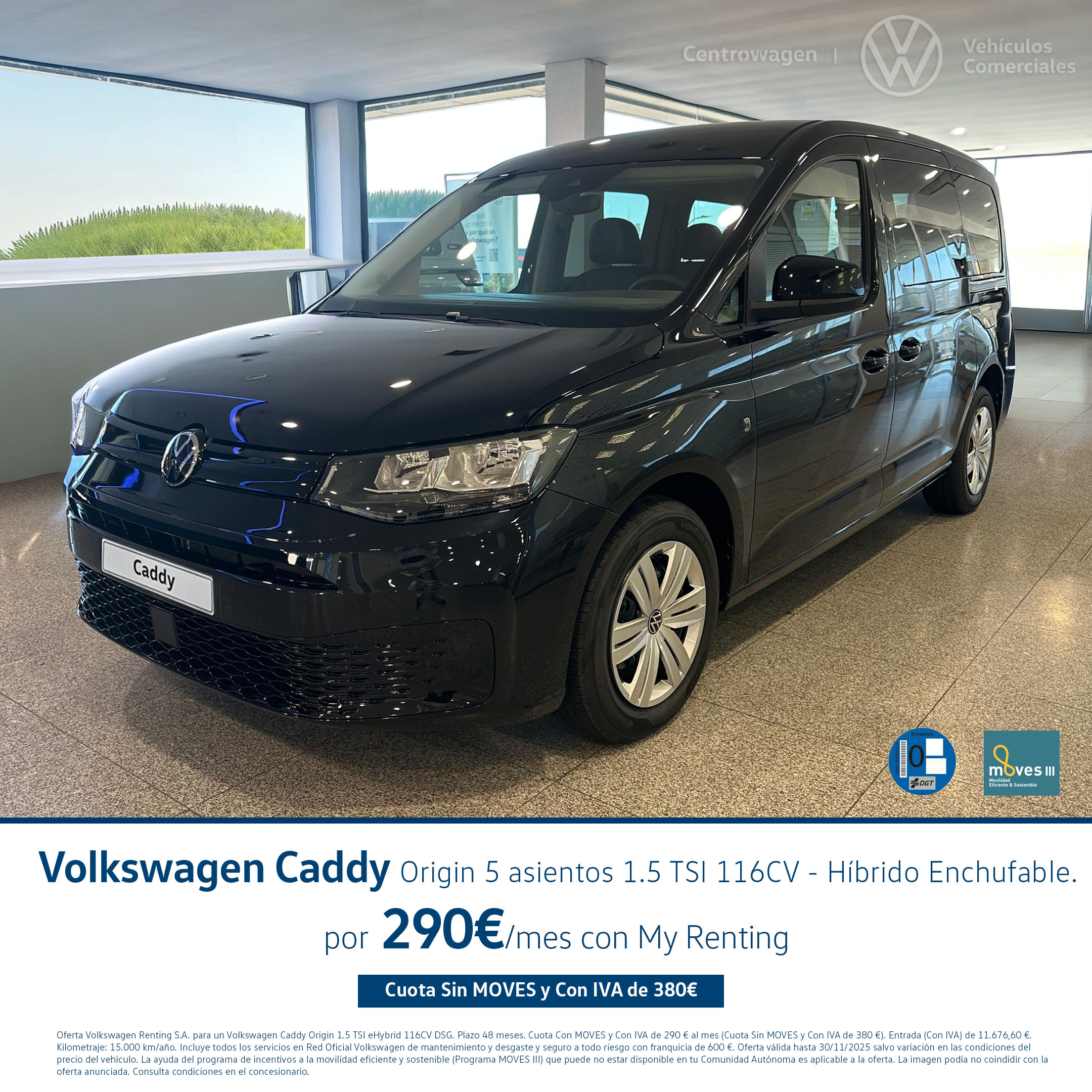 Oferta Volkswagen Renting S.A. para un Volkswagen Caddy Origin 1.5 TSI eHybrid 116CV DSG. Plazo 48 meses. Cuota Con MOVES y Con IVA de 290 € al mes (Cuota Sin MOVES y Con IVA de 380 €). Entrada (Con IVA) de 11.676,60 €. Kilometraje: 15.000 km/año. Incluye todos los servicios en Red Oficial Volkswagen de mantenimiento y desgaste y seguro a todo riesgo con franquicia de 600 €. Oferta válida hasta 30/11/2025 salvo variación en las condiciones del precio del vehículo. La ayuda del programa de incentivos a la movilidad eficiente y sostenible (Programa MOVES III) que puede no estar disponible en tu Comunidad Autónoma es aplicable a la oferta. El modelo de la imagen puede no ser el de la oferta anunciada.