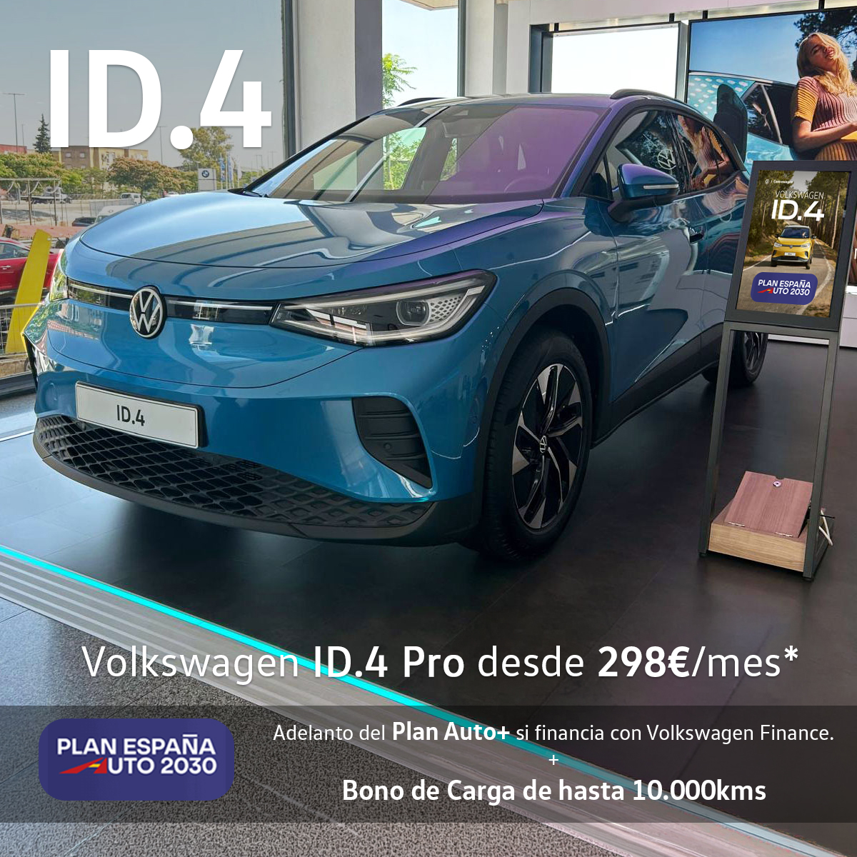 Oferta para un ID.4 Pro Pro 210 kW (286 CV) 77 kWh Automático 1 vel. con un PVP recomendado financiando en Península y Baleares de 43.145,78 € (IVA, transporte, impuesto de matriculación, descuento de marca y concesionario y bonificación Volkswagen Bank GmbH S.E. incluidos). Oferta de financiación válida para clientes particulares que financien un crédito mínimo de 29.802,60 € con una permanencia mínima de la financiación de 48 meses a través de Volkswagen Bank GmbH S.E. (según condiciones contractuales). Ejemplo: 48 cuotas de 298,07 € y, si lo deseas, al cabo de 4 años podrás cambiarlo por otro modelo, devolverlo o quedártelo pagando la cuota final de 21.154,96 € (calculada con 10.000 km anuales).TAE: 6,81 %. La oferta incluye los siguientes servicios opcionales y financiados que no están incluidos como gasto en el cálculo de la TAE: Volkswagen Long Drive Standard Ev (48 Meses / 120.000Km) Durante48 Meses O 120.000 Km. Entrada: 14.500,00 €. Importe total del crédito: 29.802,60 €. Comisión de apertura financiada: 3,50 %(1.007,82 €). TIN: 5,50 %. Importe de los intereses: 5.659,72 €. Coste total del crédito: 6.667,54 €. Importe total adeudado: 35.462,32 €. Precio total a plazos: 49.962,32 €. Precio al contado:43.145,78 €. Precio financiado 43.145,78 €. Sistema de amortización francés. El modelo visualizado puede no corresponder exactamente con el ofertado. Oferta válida hasta fin de mes.