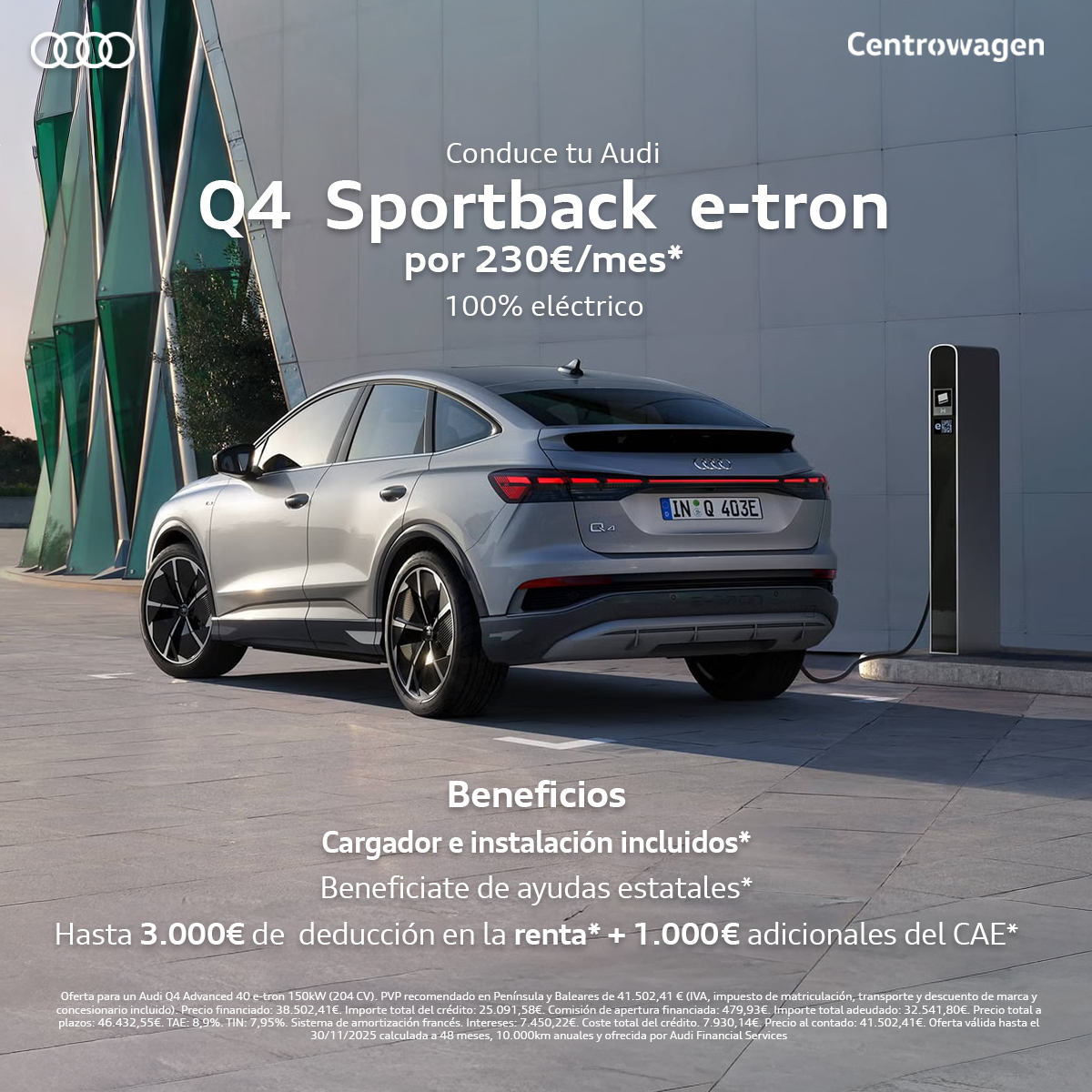 *Sujeto a condiciones del fabricante, disponibilidad y requisitos de las ayudas estatales.Oferta para un Audi Q4 Advanced 40 e-tron 150kW (204 CV). PVP recomendado en Península y Baleares de 41.502,41 € (IVA, impuesto de matriculación, transporte y descuento de marca y concesionario incluido). Precio financiado: 38.502,41€. Importe total del crédito: 25.091,58€. Comisión de apertura financiada: 479,93€. Importe total adeudado: 32.541,80€. Precio total a plazos: 46.432,55€. TAE: 8,9%. TIN: 7,95%. Sistema de amortización francés. Intereses: 7.450,22€. Coste total del crédito. 7.930,14€. Precio al contado: 41.502,41€. Oferta válida hasta el 30/11/2025 calculada a 48 meses, 10.000km anuales y ofrecida por Audi Financial Services.
